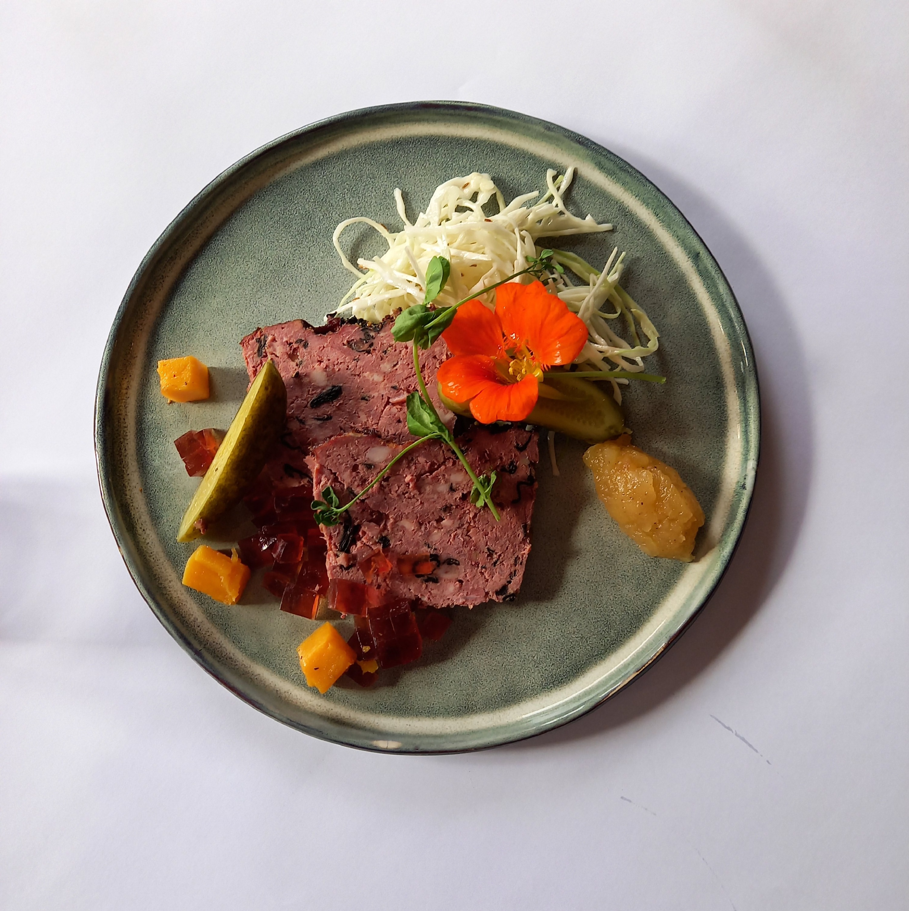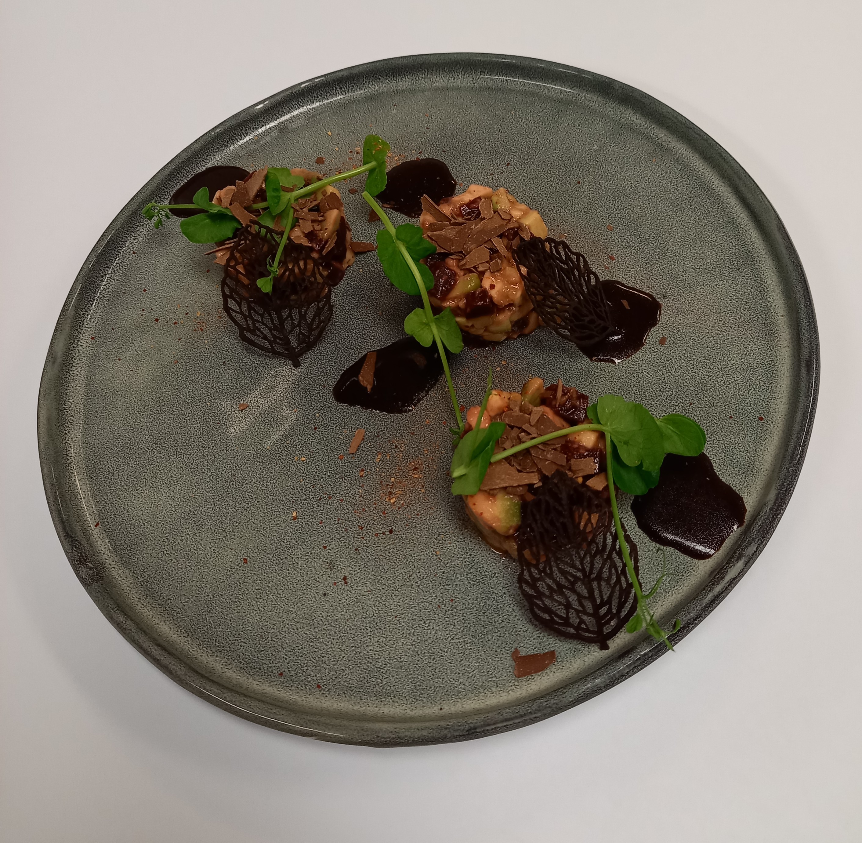 Terrine de gibiers maisonTartare de betteraves, avocat,chocolat noir